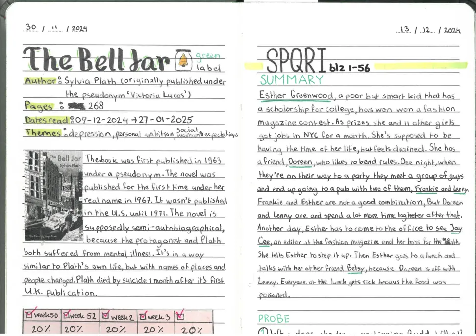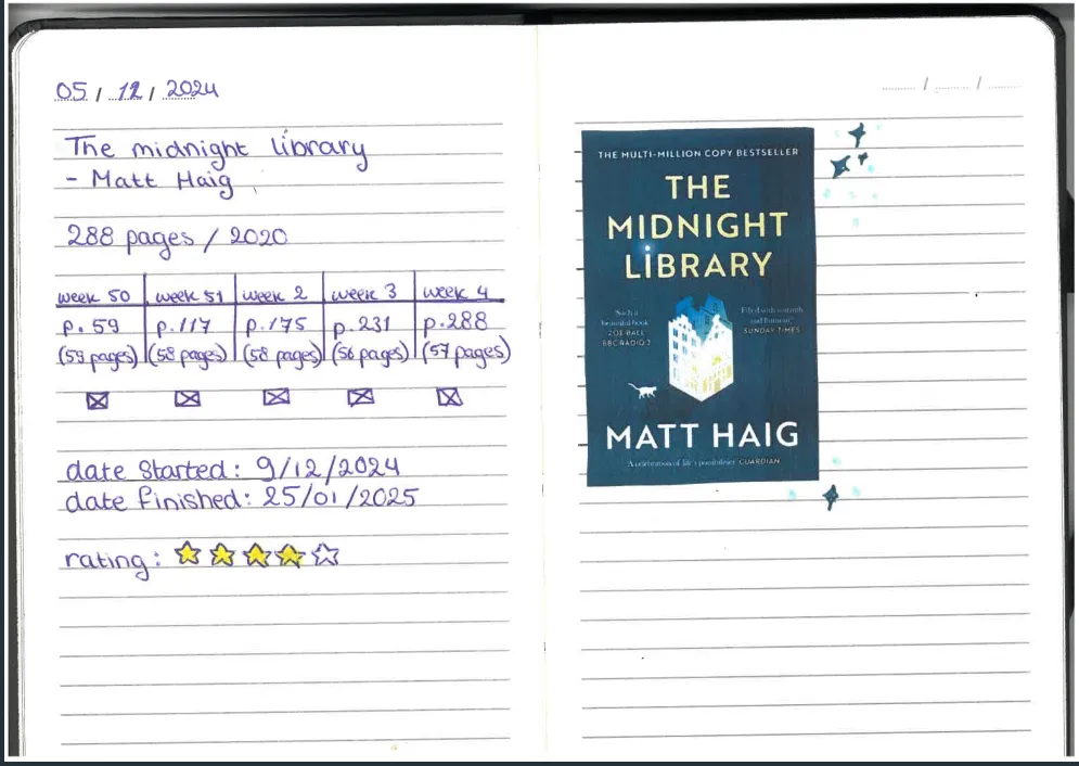 In de eerste week kiezen en regelen leerlingen een boek. Er is redelijk veel vrije keuze. Ze kunnen mijn website www.rookreading.com gebruiken om ideeën op te doen en het niveau van het boek te vinden (de ‘labels’), maar ook zelf met boektitels komen. Een groot deel koos boeken zoals The Bell Jar, The Great Gatsby, of The Catcher in Rye. Een aantal leerlingen die totaal niet wisten wat ze moesten heb ik The Midnight Library aangeraden. Geen enkele leerling had een boek dat een lager niveau had dan Young Adult. Hier hoefde ik niet in bij te sturen.