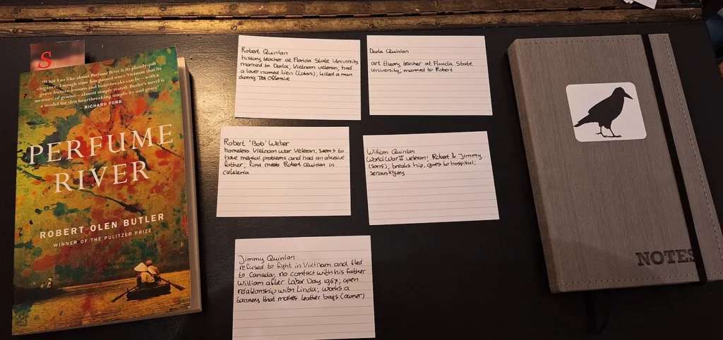 Ik heb eerst de complete opdracht zelf gedaan met het boek Perfume River van Robert Olen Butler. Op deze manier kon ik bepalen of de opdracht haalbaar was en kon ik voorbeelden laten zien over wat ik met de opdracht voor ogen had. Ook wilde ik een een inspiratiebron voor mijn leerlingen. Ik heb er bewust voor gekozen een middenweg te kiezen in de presentatie. Er zijn leerlingen die meer werk hebben gemaakt dan dat ik heb gedaan, maar er zijn ook leerlingen geweest die het basaal hebben gehouden maar wel hebben voldaan aan de opdracht. Ik ben dit jaar gezegend met een fijna 4e klas die het project grotendeels hebben omarmd.