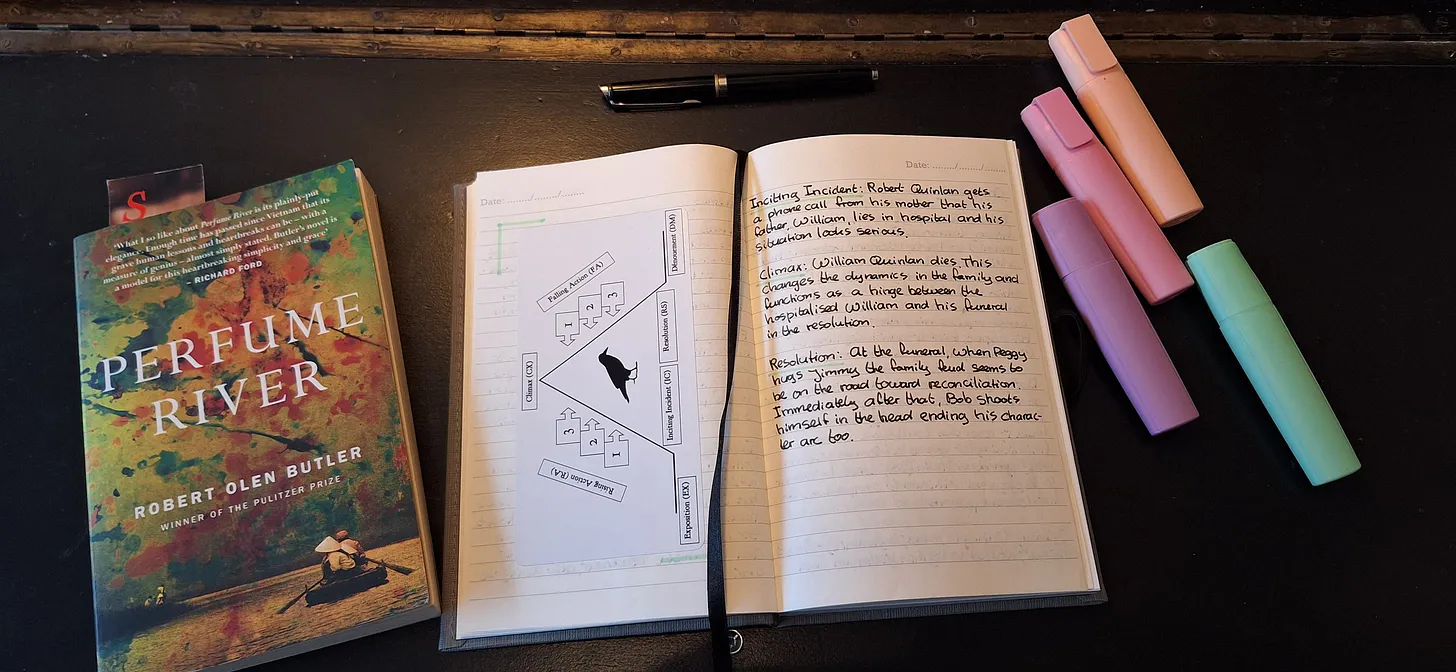 Ik heb eerst de complete opdracht zelf gedaan met het boek Perfume River van Robert Olen Butler. Op deze manier kon ik bepalen of de opdracht haalbaar was en kon ik voorbeelden laten zien over wat ik met de opdracht voor ogen had. Ook wilde ik een een inspiratiebron voor mijn leerlingen. Ik heb er bewust voor gekozen een middenweg te kiezen in de presentatie. Er zijn leerlingen die meer werk hebben gemaakt dan dat ik heb gedaan, maar er zijn ook leerlingen geweest die het basaal hebben gehouden maar wel hebben voldaan aan de opdracht. Ik ben dit jaar gezegend met een fijna 4e klas die het project grotendeels hebben omarmd.